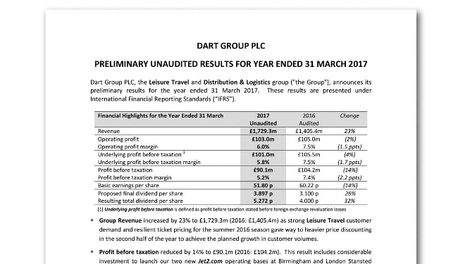 Dart Group announces Preliminary Results 2017
